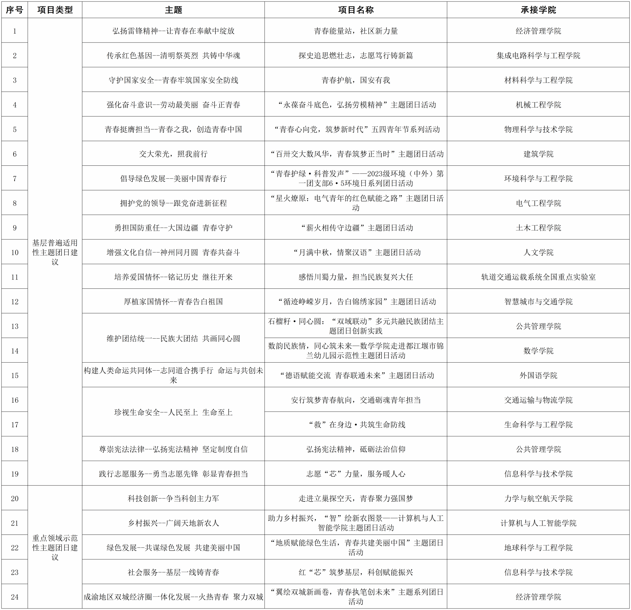 根据《关于“揭榜挂帅”创新开展西南交通大学2025年示范性主题团日活动的通知》,经过各二级团组织申报、校团委对活动主题、活动内容、活动可行性、活动创新性等方面进行了综合评审,审批立项“示范性主题团日活动”24项,现将立项结果公示如下:
