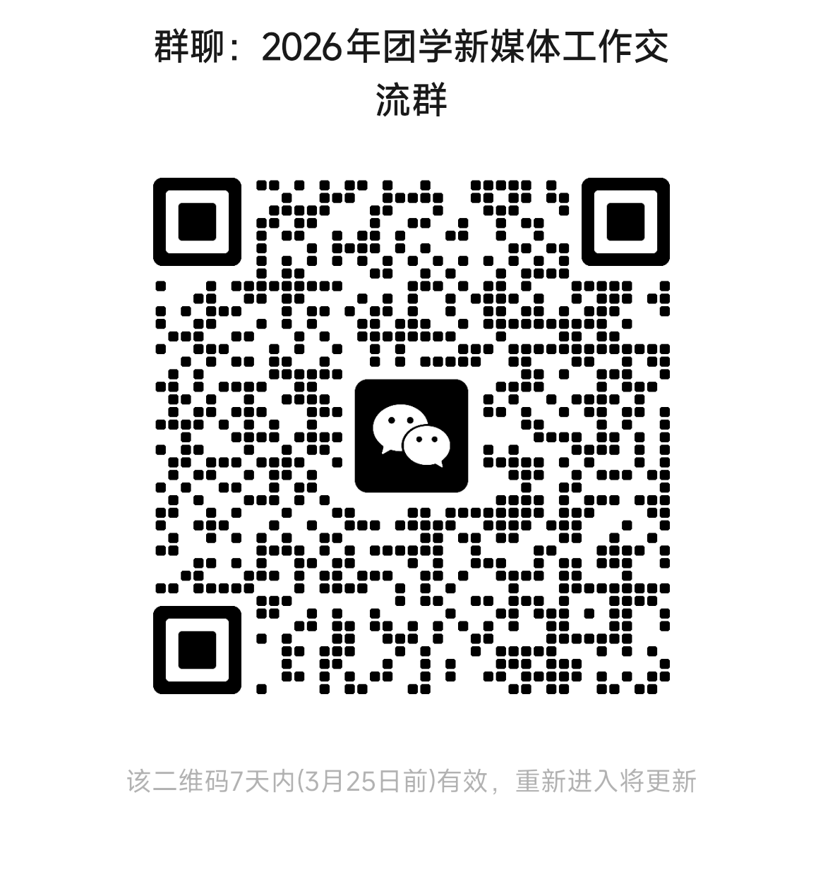 请各二级团组织负责团学新媒体指导工作的相关教师实名加入“2026年团学新媒体交流工作群”(微信扫描下方二维码),为避免信息打扰,按惯例已完成工作交接的老师可以选择退群,新入群的老师请修改备注“学院+姓名”