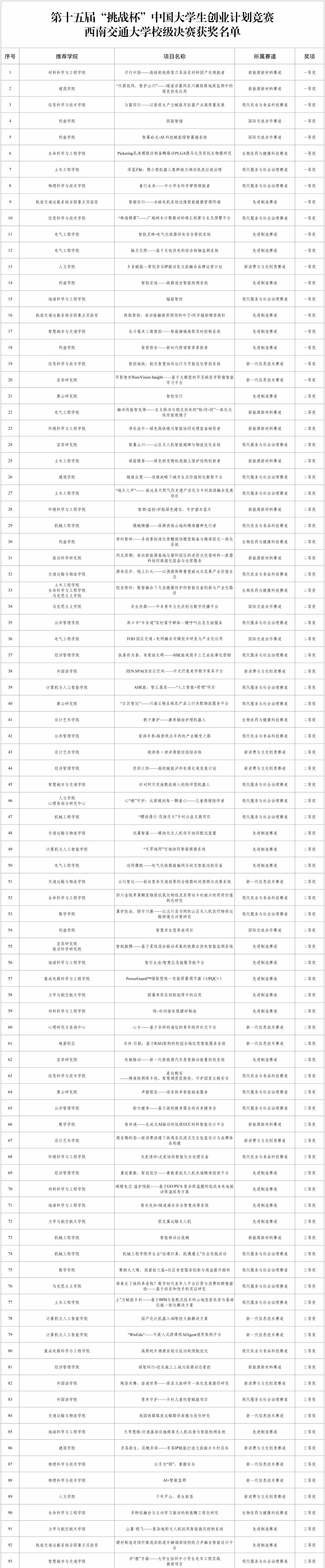 关于第十五届“挑战杯”中国大学生创业计划竞赛西南交通大学校赛获奖名单公示
