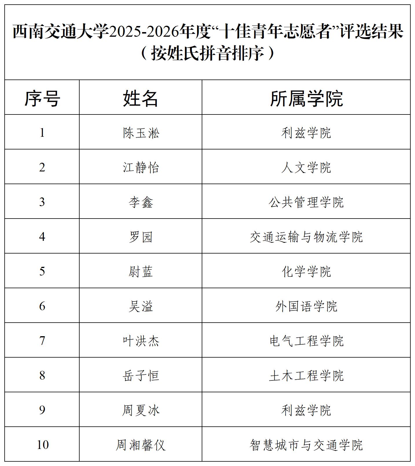 为全面贯彻落实党的二十大和二十届历次全会精神,认真落实四中全会部署,深入学习贯彻习近平总书记给四所交通大学全体师生重要回信精神,全面贯彻习近平总书记关于青年工作的重要思想和关于志愿服务的重要论述,发扬“奉献、友爱、互助、进步”的志愿精神,树立典型,表彰先进,引导在校学生积极参加志愿服务,推动我校志愿服务制度化、常态化、科学化发展,强化实践育人成效,校团委决定举办西南交通大学2025-2026年度“十佳青年志愿者”评选活动。经志愿者个人报名申请、学院审核汇总、校团委组织评审,现将西南交通大学2025-2026年度“十佳青年志愿者”评选结果进行公示: