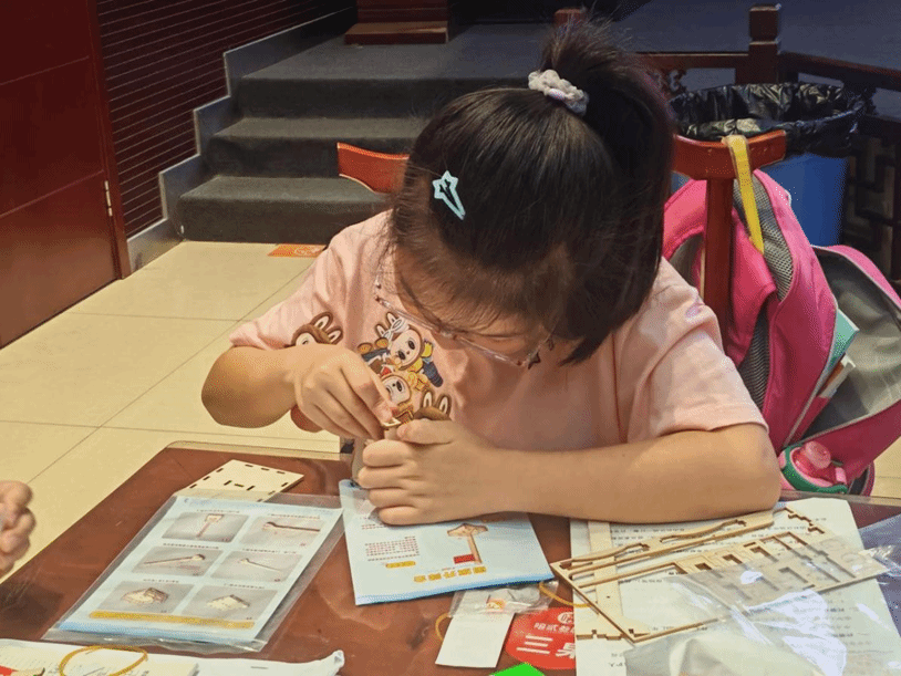 7月9日,犀和社区的50名儿童参与了“机械童趣课堂”。实践队先通过动画展示升旗装置齿轮箱,点明齿轮传动作用;再用钟表齿轮模型演示原理,随后引导孩子们动手操作滑轮构件,在反复调试中组装成简易升旗装置。从认知原理到掌握实际技能,孩子们不仅学到了机械知识,更真切体会到科技赋能生活的力量。
