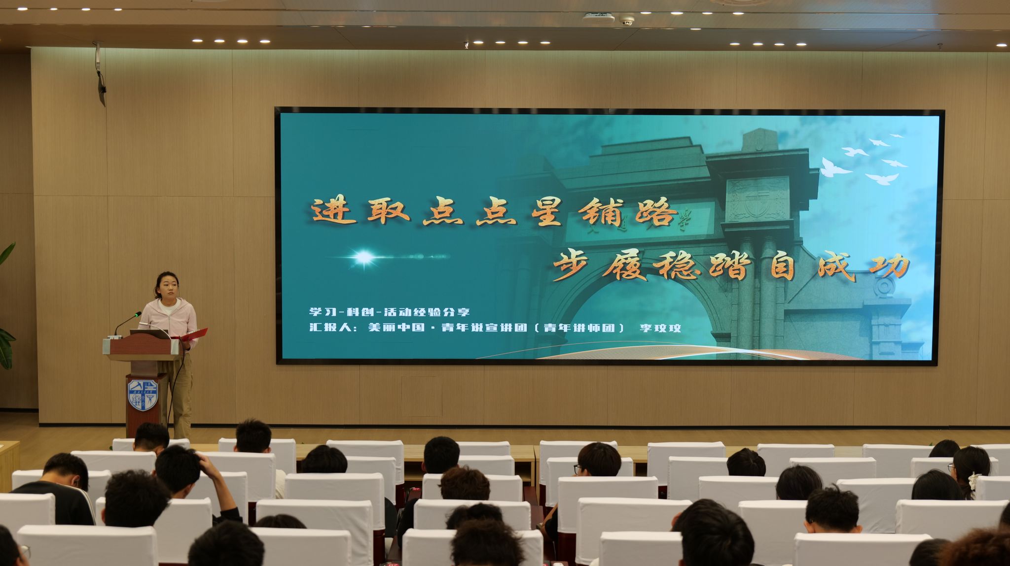 李玟玟以结合自身大学经历为题,从学习探索、工作担当、实践躬行三方面展开。学习方面,通过剖析个人大一成绩中游的困境,分享组建学习小组、远离过度娱乐干扰的调整方法,提出“博观而约取,厚积而薄发”的学习理念。科创方面,结合个人参与SRTP项目、获国家级学科竞赛的经历,鼓励学子勇敢尝试科创。学生工作中,她以历任班级组织委员、青协会长的经历,讲解如何在学生工作中培养责任与组织能力。实践方面,她分享到“文明其精神,野蛮其体魄”,鼓励大家兼顾学业与身心健康,既要坚持规律锻炼强健体魄,也要多阅读经典著作丰富精神世界。