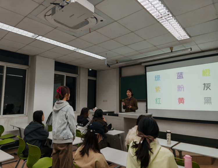 本次活动分为四个部分:“热场破冰”、“自我抒发”、“鼓励自我”和“传递力量”,将心理治愈渗透于趣味互动中,让同学们在轻松氛围中为心理健康注入动能。 活动伊始,“看字说颜色”热场游戏迅速点燃现场氛围。当不同色彩书写的颜色名称交替呈现,参与者需快速反应说出字体颜色而非文字本身——当“蓝”字以绿色呈现时,准确回答“绿”才能通关。答错的同学通过回答心理小问题加深互动,不仅锻炼了大脑抑制习惯性思维的能力,更打破了彼此间的陌生感,让活动现场迅速升温。