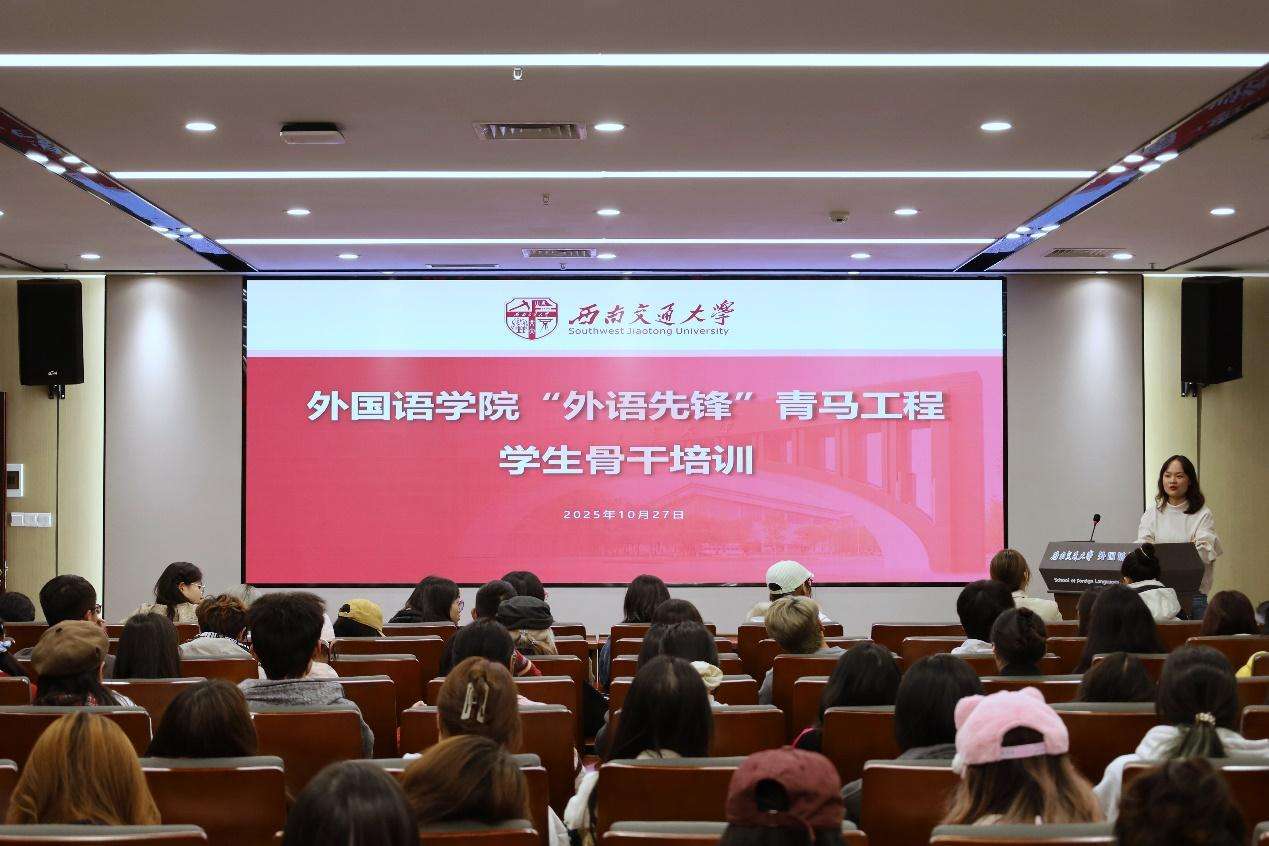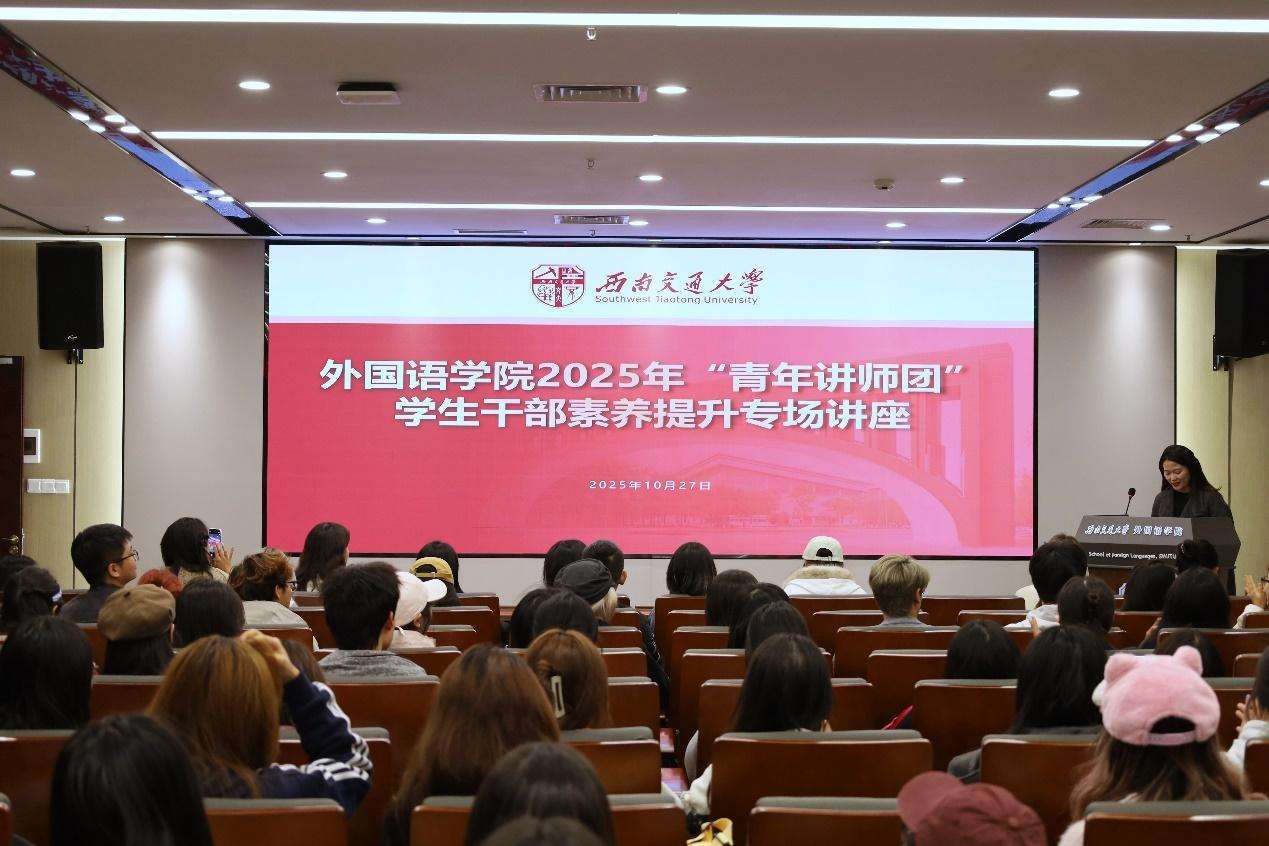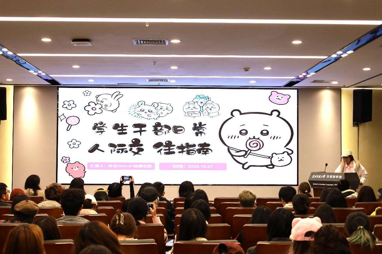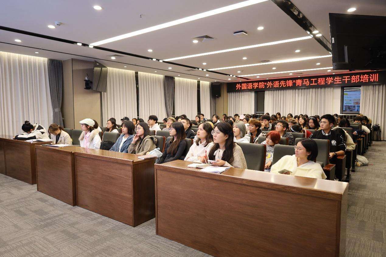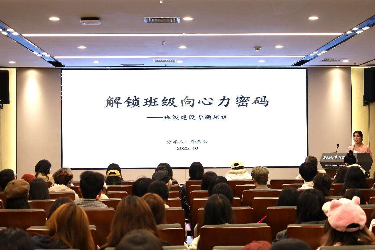 为进一步提高学生骨干的工作能力与服务意识,促进班风建设工作质量提升,强化各班良好、融洽、温暖的班集体氛围,10月27日晚,外国语学院举办2025年秋季学期“外语先锋”青马工程学生骨干培训。本次培训邀请学院青年讲师团成员、校级“十佳”心理委员刘嘉玲,带领班级多次荣获集体荣誉称号的外汉2023-01班班长张仪萱以及外汉2024-01班心理委员黄左骏,围绕班级骨干应掌握的“三重力度”,即领导力、共情力、亲和力,从实际工作经历出发,以同龄人视角总结有益经验,面向学院全体学生干部进行分享交流。