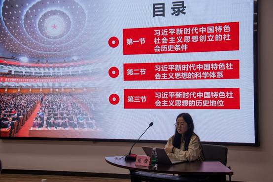 张欢老师围绕习近平新时代中国特色社会主义思想“创立的历史条件”“科学体系”“历史地位”三个方面展开讲解。