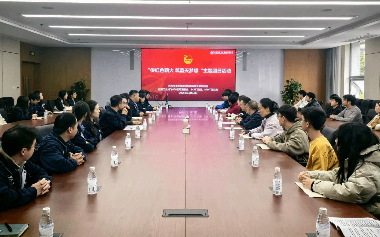 2025年11月12日下午,西南交通大学信息科学与技术学院与航空工业成飞460公司、143厂、870厂联合举办的“传红色薪火·筑蓝天梦想”主题团日活动在成飞公司成功举行。西南交通大学信息科学与技术学院党委副书记、纪委书记傅尤刚,航空工业成飞460公司党委书记唐典荣,以及双方单位的师生代表、团员青年代表共同参与了此次活动。