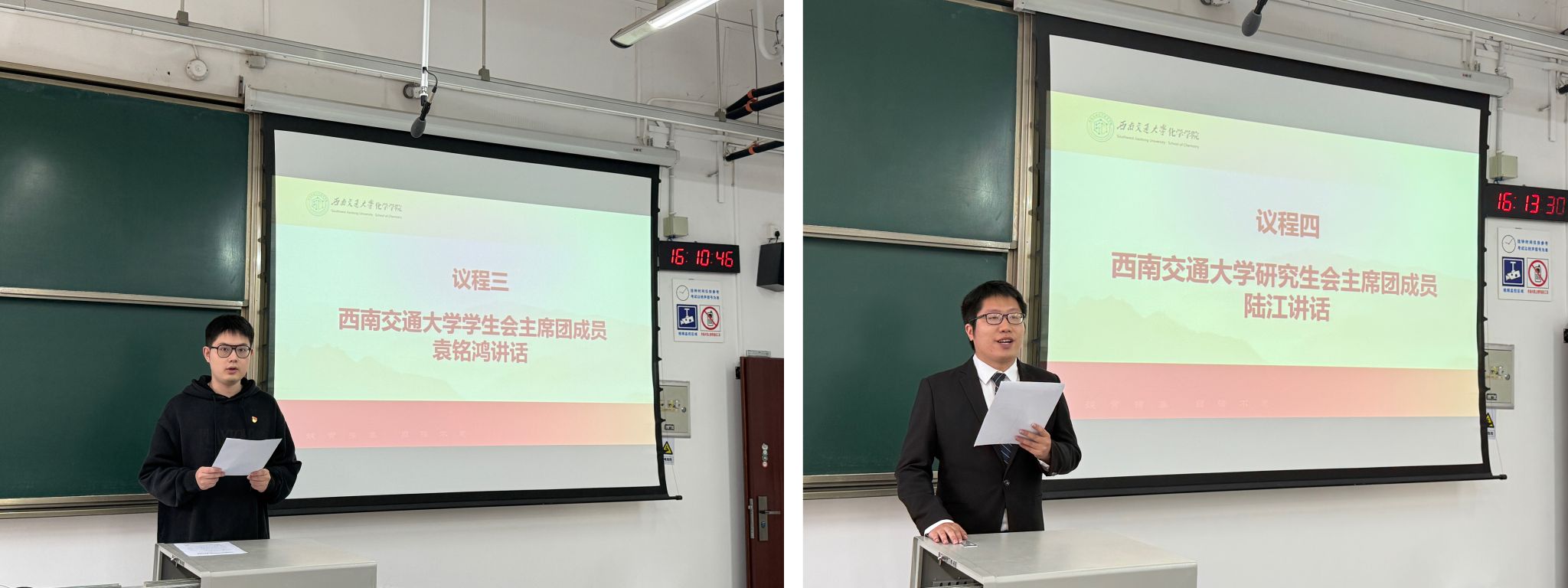 学校学生会主席团成员袁铭鸿、研究生会主席团成员陆江分别致辞,他们代表学校学生会组织对大会的召开表示祝贺,分享了校学生会、研究生会的工作经验与创新思路,希望化学学院学生组织能与校组织深化协作、携手共进,共同打造更具影响力的校园品牌活动,助力学生全面发展。
