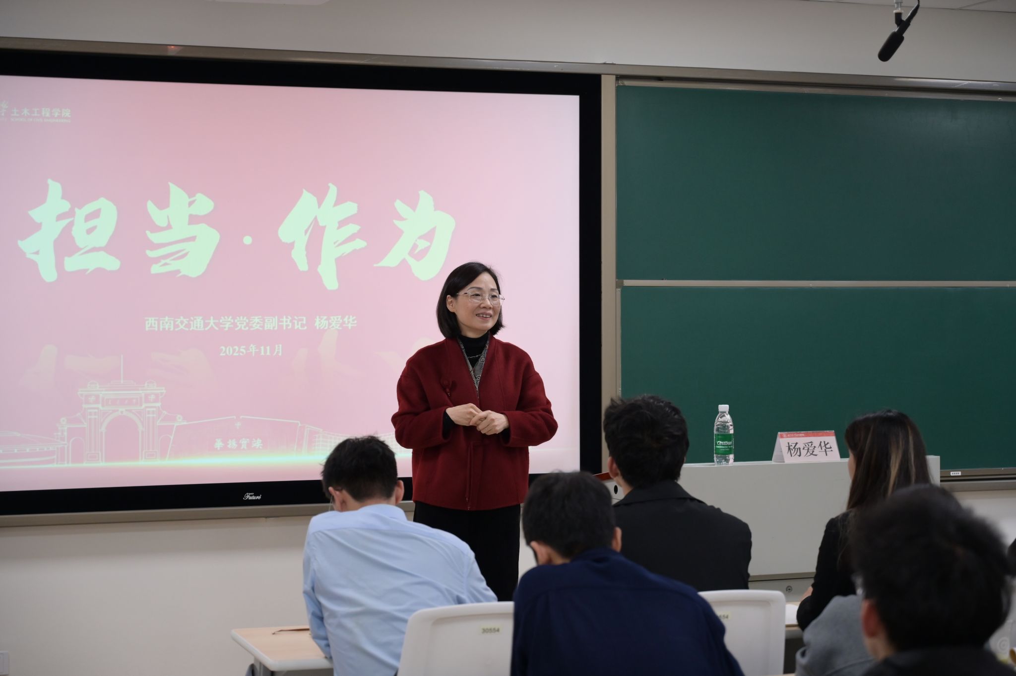 为深入学习贯彻党的二十届四中全会精神,扎实落实立德树人根本任务与“三全育人”教育使命,进一步提升团学骨干综合能力与责任意识,11月13日下午,学院在X30554教室开展砼心聚力育新才——土木工程学院“青马工程”团学骨干思政大课堂,由西南交通大学党委副书记杨爱华授课。