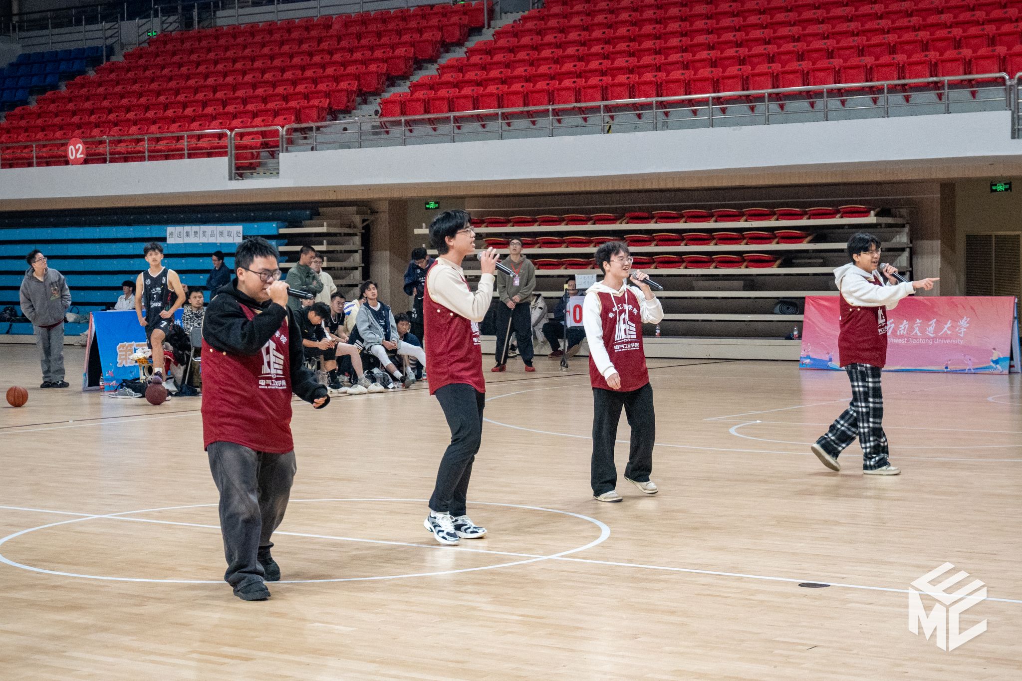 中场环节,陈春宇同学以一首说唱《兰花草》炸场,将现场氛围推向新的高潮。随后进入“师生4V4挑战赛”,由“辅导员队”对抗“学生队”。比赛伊始,“辅导员队”频频进球,迅速拉开分差。“学生队”不甘示弱,拿下四个三分球拉近比分,最终以2分分差惜败“辅导员队”。