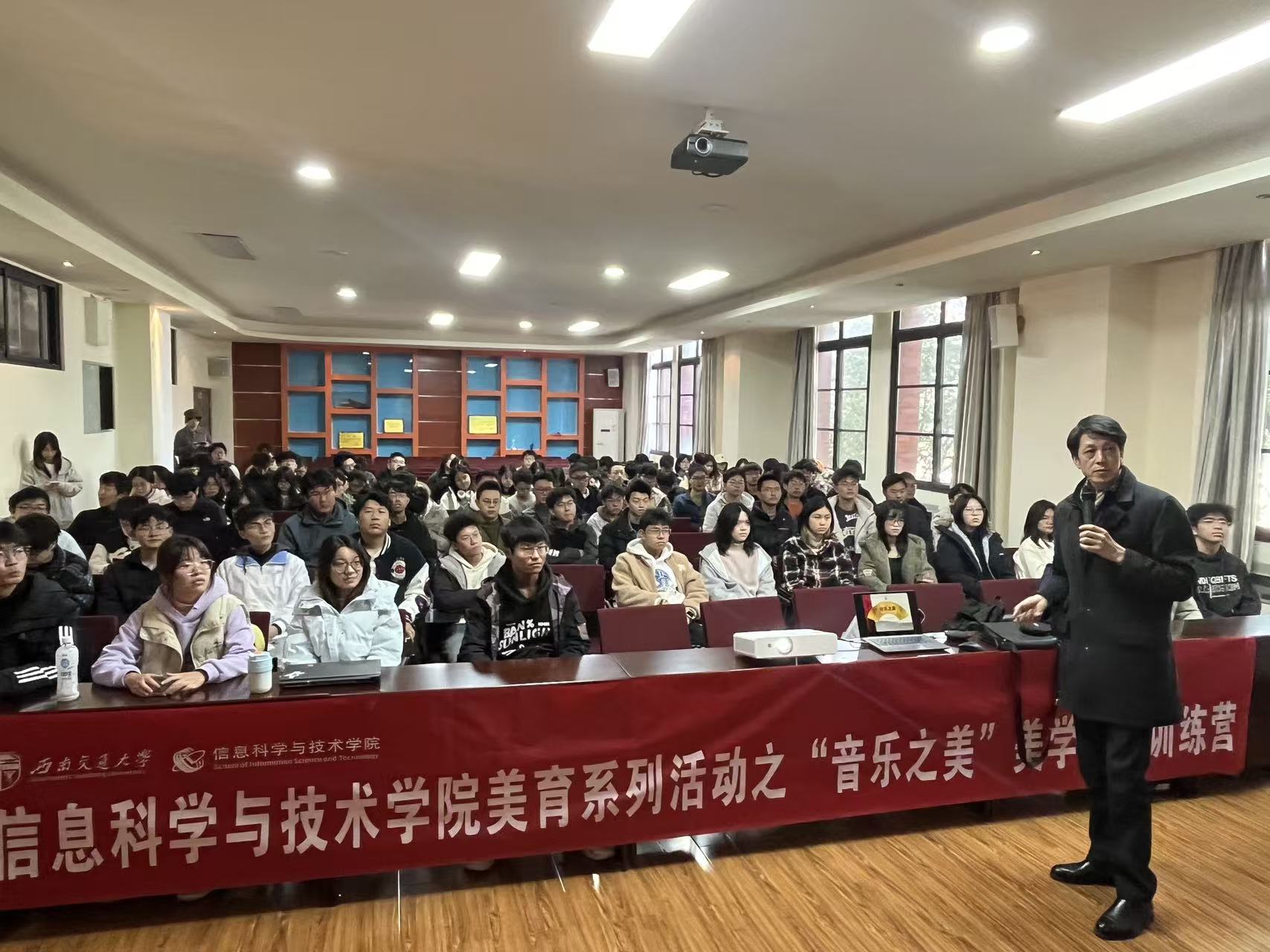 2025年12月5日,信息科学与技术学院在犀浦校区9219教室开办“音乐之美”美学提升训练营。本次活动特邀人文学院杨自力老师担任主讲人,杨老师以贝多芬 “音乐是比一切智慧、一切哲学更高的启示” 的名言破题,带领同学们开启音乐知识探索之旅。课堂上,他从基础乐理概念切入,清晰区分乐音与噪音的本质差异,随后深入阐释音乐的核心定义,点明其作为人类特有“声音语言”,以旋律、节奏、复调、和声为表现载体,凝聚着人类智慧与情感的独特属性。