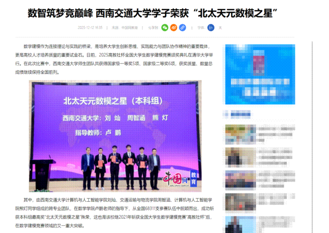 宣传推广方面,协会全年通过校公众号、本科生院、数派传媒等校内新媒体平台及小红书、中国网教育等校外渠道发布相关推文60余篇,总阅读量超10万次。凭借在全国大学生数学建模竞赛等赛事中的优异表现,协会相关事迹被多家教育媒体转发报道,“交大建模”的品牌影响力持续扩大,成为学校学术科创领域的特色名片。