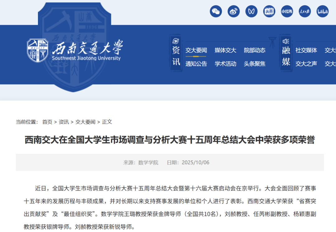 近日,西南交通大学2025年度学生社团评优结果公布,数学建模协会以综合评分第一的成绩,再次获评年度“十佳社团”。