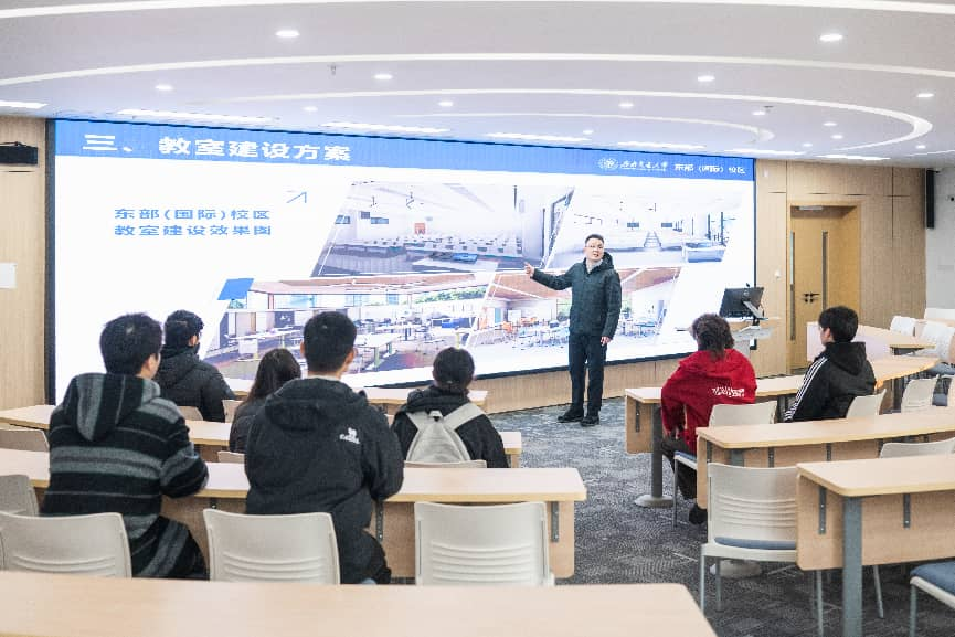 接下来,我们走进了一间环形教室,它的布局让我们倍感熟悉。校区老师告诉我们,这间教室是完全参照学院X30519环形报告厅打造的。现场已经坐满了同专业的同学,大家都在等候讲座开始。这次为我们讲解的,是校区管委会副主任刘先峰和事业发展办公室副主任夏旭,他们给我们介绍了校区的建设背景、战略意义,还有现代化教学空间的配置。更让我们惊喜的是,本次课程还邀请到了法国拉罗谢尔大学土木工程和力学系的Olivier MILLET教授,带领我们开启了一次精彩的国际化课程体验。