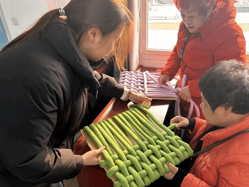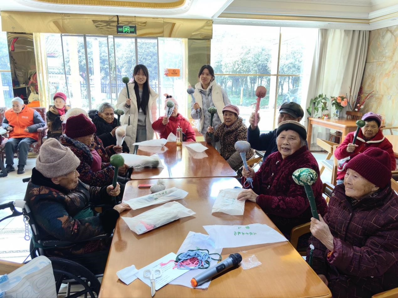 第二场活动以传统艾锤养生为主题展开。实践队采用“理论讲解+动手实践”的模式,向老人们普及了艾锤温经通络、驱寒除湿的养生作用,并全程陪伴、协助老人们亲手制作艾锤。穿绳、固定、装饰,每一个步骤都饱含心意,老人们在动手实践中不仅学会了实用的日常养生方法,更收获了一份凝聚着青春关怀的专属养生工具。