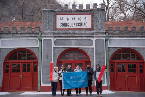 1月24日,实践队直抵京张铁路的灵魂枢纽——青龙桥火车站。这座始建于1908年的车站,静卧于八达岭长城与青山的怀抱之中,青砖灰瓦、红门旧窗。队员们怀着崇敬的心情,开始了微团课的拍摄工作。古朴门头下,主讲人细数车站的百年变迁;长城之巅上,“人” 字形线路全景舒展,主讲人将詹天佑的工程智慧与爱国情怀融入眼前壮阔景象,阐释这项伟大工程超越时代的精神象征。朔风凛冽吹不散赤诚之志,镜头之下诉不尽敬仰之情,青年学子的深情讲述在寒风中更显铿锵有力。