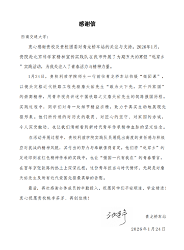 百卅交大,源远流长;精神之火,代代相传。为深入弘扬以爱国、创新、求实、奉献、协同、育人为核心的科学家精神,落实西南交通大学“弘扬科学家精神,做新时代追梦人”寒假社会实践专项要求,2026年1月24日至28日,利兹学院“寻詹公铁路足迹,铸青年报国初心”实践队远赴北京,走进詹天佑纪念馆、青龙桥火车站等历史地标,开展主题微团课拍摄与实地研学活动。队员们沿着百年铁路轨迹,触摸中国铁路事业的奋斗印记,在跨越时空的对话中感悟交大名誉校友詹天佑先生“勇攀高峰、敢为人先、胸怀祖国、服务人民”的精神力量。