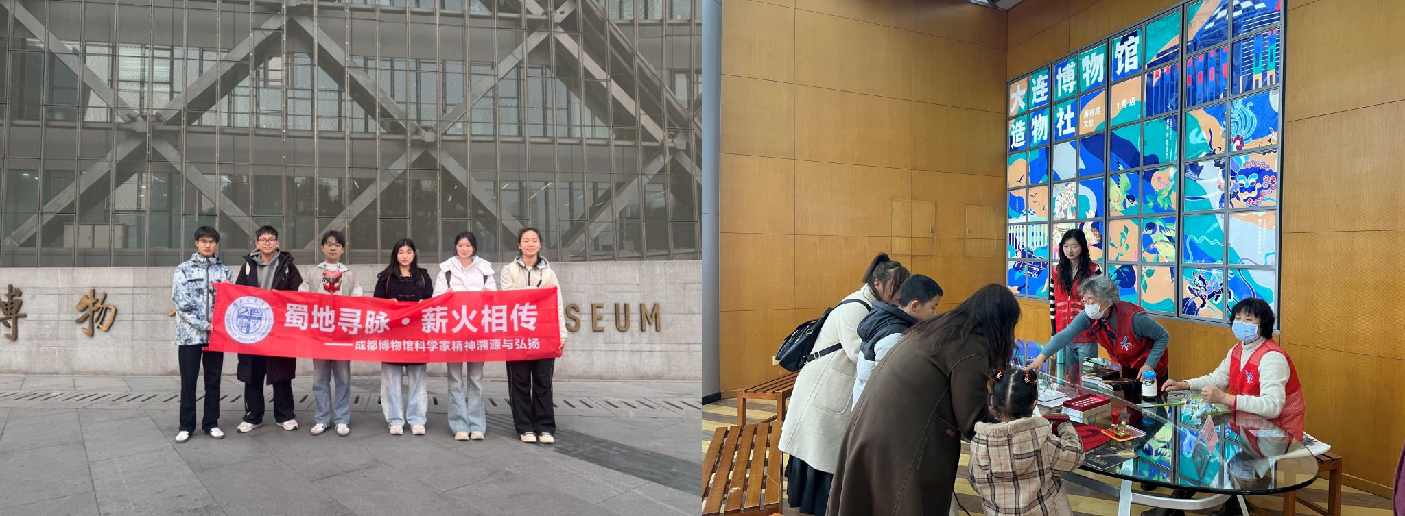 学院“蜀地寻脉•薪火相传”实践队走进成都博物馆,围绕“国宝西迁与文化入川”开展专题实践。队员们系统学习抗战时期文物迁徙的历史脉络,深挖茅以升等交大先辈科学报国的成长与从业事迹,通过专题研讨、问卷调查等形式,梳理科学家精神与交大校训、校史传承的内在关联。团队还赴大连博物馆开展跨地域学习交流,结合自身实践感悟,于大连博物馆内分享交大校史故事与先辈事迹,在实地研学中厚植爱校荣校情怀。