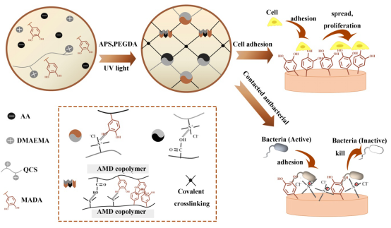 针对以上难题,材料科学与工程学院鲁雄教授课题组采用材料基因工程的方法,使用高通量的筛选阴、阳离子的比例,一次性大批量制备出不同比例的基体,通过对材料机械性能进行筛选,最终得到具有较好机械性能的基体材料。由于聚(丙烯酸-co-甲基丙烯酸2-(二甲基氨基)乙酯)水凝胶体系中缺乏具有细胞亲和性的活性基团,因此其生物相容性较差。针对这一问题,在聚(丙烯酸-co-甲基丙烯酸2-(二甲基氨基)乙酯)水凝胶体系引入仿贻贝材料多巴胺来增加材料的细胞亲和性。并对多巴胺单体进行双键化修饰制备双键化多巴胺,解决了该水凝胶细胞/组织亲和性差的问题。为了实现高效抗菌的目的,对壳聚糖进行季铵化修饰 (QCS)增强壳聚糖的抗菌性,并与三元共聚物水凝胶形成互穿网路,进一步增强水凝胶的抗菌性和机械性能,最终得到一种仿贻贝高细胞亲和性、超强,可回复的、接触增强抗菌水凝胶。该水凝胶为解决水凝胶的抗菌性和组织亲和性二者难以平衡的问题提供了一种新的思路。