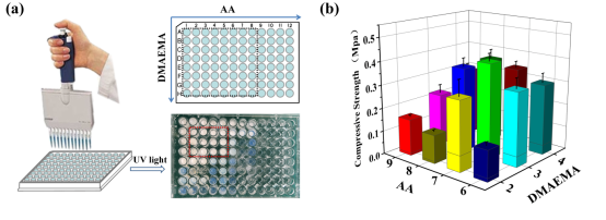 图1. (a)阴阳离子比例的高通量制备以及力学性能筛选。(a)阴阳离子水凝胶阵列的高通量制备以及实物图;(b)水凝胶(红色虚线区域)的压缩强度