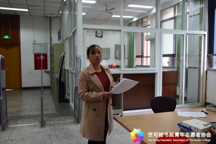接着,艾世尧老师发表讲话,艾老师向同学们介绍了此次活动的意义、志愿活动的内容,并向大家具体讲解了如何整理归还书籍。同学们在艾老师的解说下了解了每一项任务的具体操作流程。