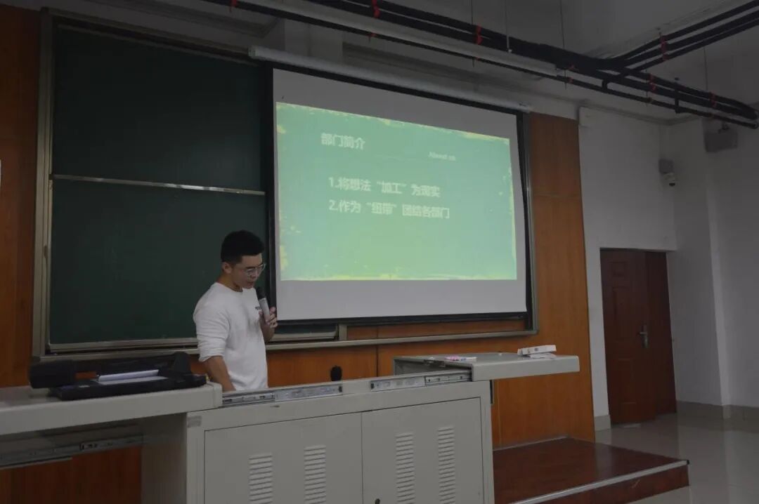 接着,各组织依次进行招新宣讲。为吸引更多新生的加入,各组织在招新中可谓“八仙过海,各显神通”,紧密结合部门职能工作,通过展示日常工作的Vlog、凸显特色的剪辑视频、精心准备的吉他弹奏以及穿恐龙人偶服表演等,帮助新生进一步认识组织日常,感受组织氛围。