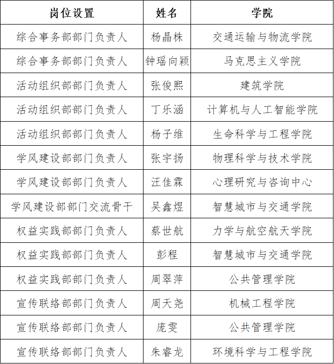 关于2025-2026学年西南交通大学学生会部门负责人名单的公示