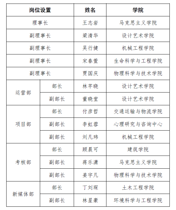 为深入学习贯彻习近平新时代中国特色社会主义思想,切实发挥好共青团服务学校立德树人根本任务和人才培养中心工作的重要作用,全面落实《西南交通大学“第二课堂成绩单”制度实施办法》(西交校〔2020〕24号)等有关文件的要求,进一步加强学校第二课堂建设,经过自主报名、资格复审、考核面试、民主考察等环节,拟确定以下同学为2025-2026学年大学生第二课堂运营中心学生骨干,具体名单公示如下: