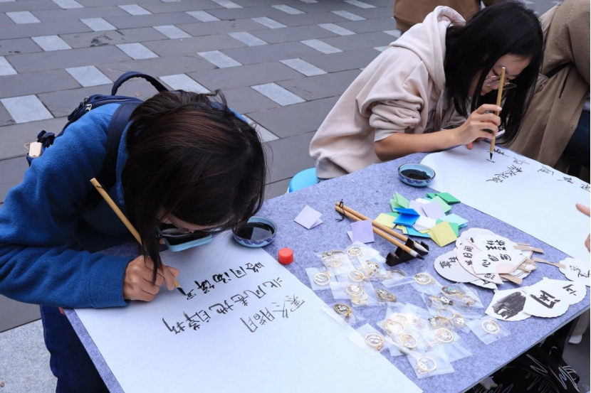 在书法体验区,同学们将从纸条中抽取一枚主题字,纸条上有“冬”、“暖”、“藏”、“安”等寓意深远的单字,同学们将以该字为创作核心,引经典之句,以笔墨进行个性化书写。同学们既可以用楷书书写“冬雪”,也可以用行书流畅呈现“暖阳”。这一过程不仅是对特定书体技法的实践,更是对汉字内涵与古典诗文意境的主动探索与诠释,让书法艺术在互动中变得可知可感。