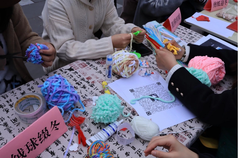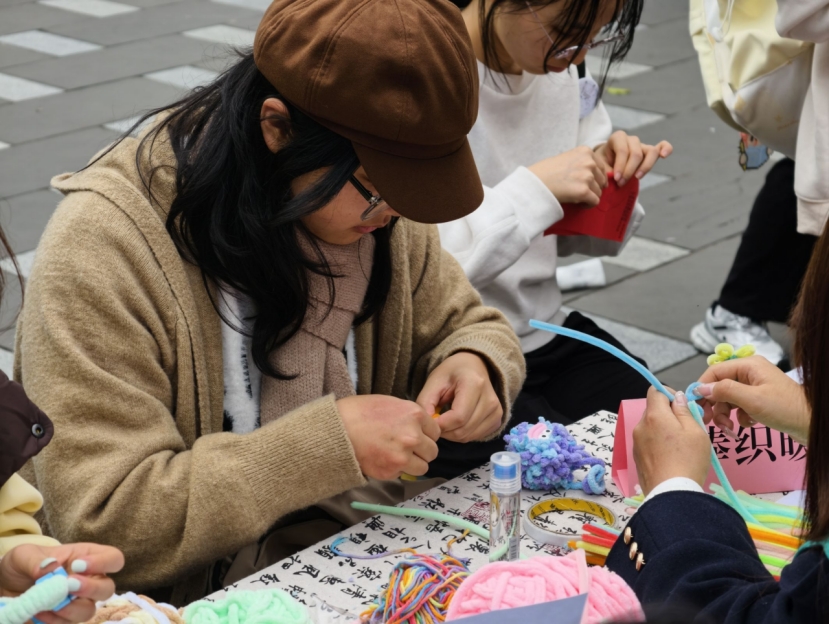扭棒织暖手工区配备多种颜色的扭扭棒材料,在工作人员的引导下,同学们学习平结、绕圈等基础编织技法,通过材料的弯曲、固定等步骤,制作出小雏菊、中国结等结艺作品。通过扭扭棒制作结艺作品既保留了传统结艺的吉祥寓意,又降低了制作难度,让同学们在编织过程中感受传统工艺与现代材料的巧妙结合。