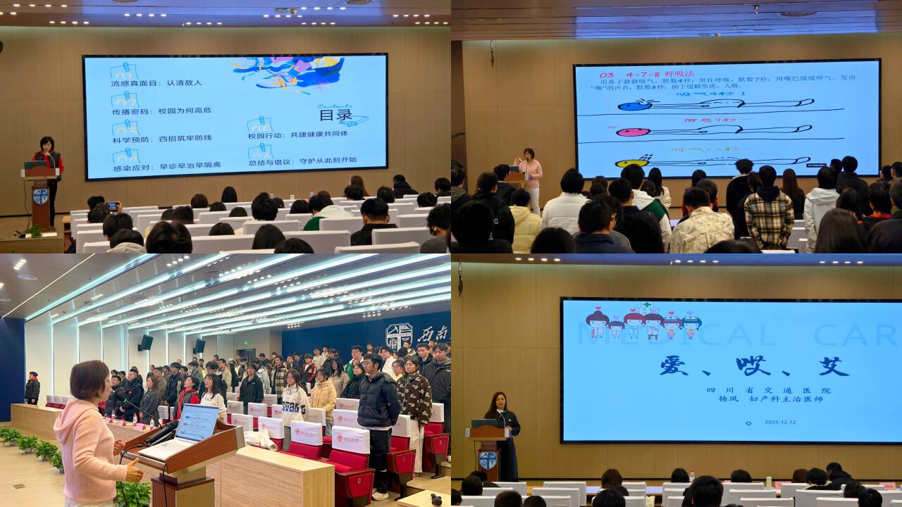 活动特邀四川省交通医院三位专家进行主题分享。药剂科主管药师侯丽芳以“大学生流感防护指南”为题,从流感本质、校园传播特点、科学预防手段及感染应对等方面展开讲解,梳理出贴近校园生活的防护要点,并纠正了大学生常见用药误区。内一科副主任医师王小华聚焦“挥别内耗,突围焦虑”,通过心理测评互动帮助师生识别心理亚健康信号,现场教授“蝴蝶拍”放松法、4-7-8呼吸法等简单易学的心理调节技巧,并带领全场师生同步体验,让大家在实践之中迅速掌握缓解学业与生活压力的实用方法。妇产科主治医师杨凤则以“爱、哎、艾”为主题,巧妙融合防艾知识与妇科健康科普,破除常见认知误区,普及了艾滋病预防与女性健康护理的关键知识。