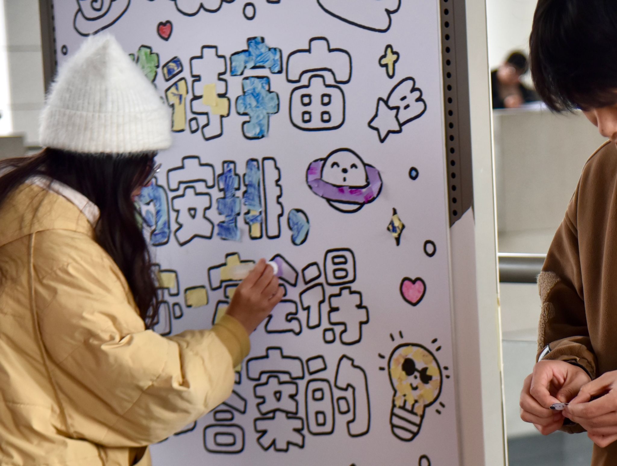 另一侧的撕纸作画解压区,成为考研学子释放备考压力的治愈空间。在志愿者引导下,学子们先写下备考中的烦恼,用水彩笔肆意涂抹覆盖,再将纸张撕碎,让积攒的压力随纸屑消散;随后把碎片拼贴在展板上,共同完成两幅集体创作,寓意加强信心的治愈历程。现场还设置“软萌纸小狗”手工环节,学子们可将考研心愿写在纸小狗上,当作随身陪伴的暖心信物,承载逐梦期许。