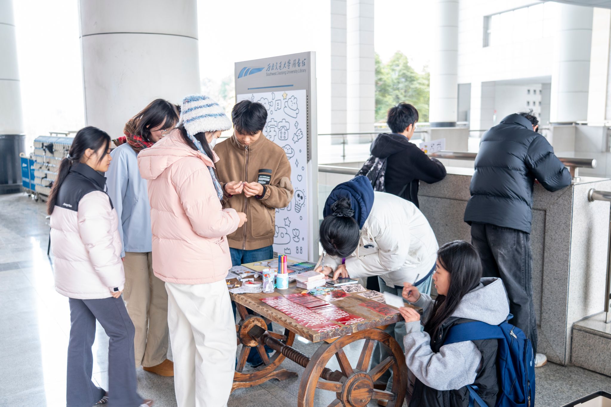 随着考研冲刺渐近,备考氛围愈发浓厚,一场暖心助研的情绪关怀活动于12月14日下午在犀浦校区图书馆二楼大厅及考研自习室门口温情展开。由智慧青协、心理青协携手校图书馆共同策划的“心晴相伴,舒然上岸”活动,以“双向互动、匿名共情、轻量解压”为理念,通过解压卡片互动、撕纸作画、手写祝福等趣味形式,为考研学子打造专属心灵驿站,舒缓备考情绪,传递冲刺力量。