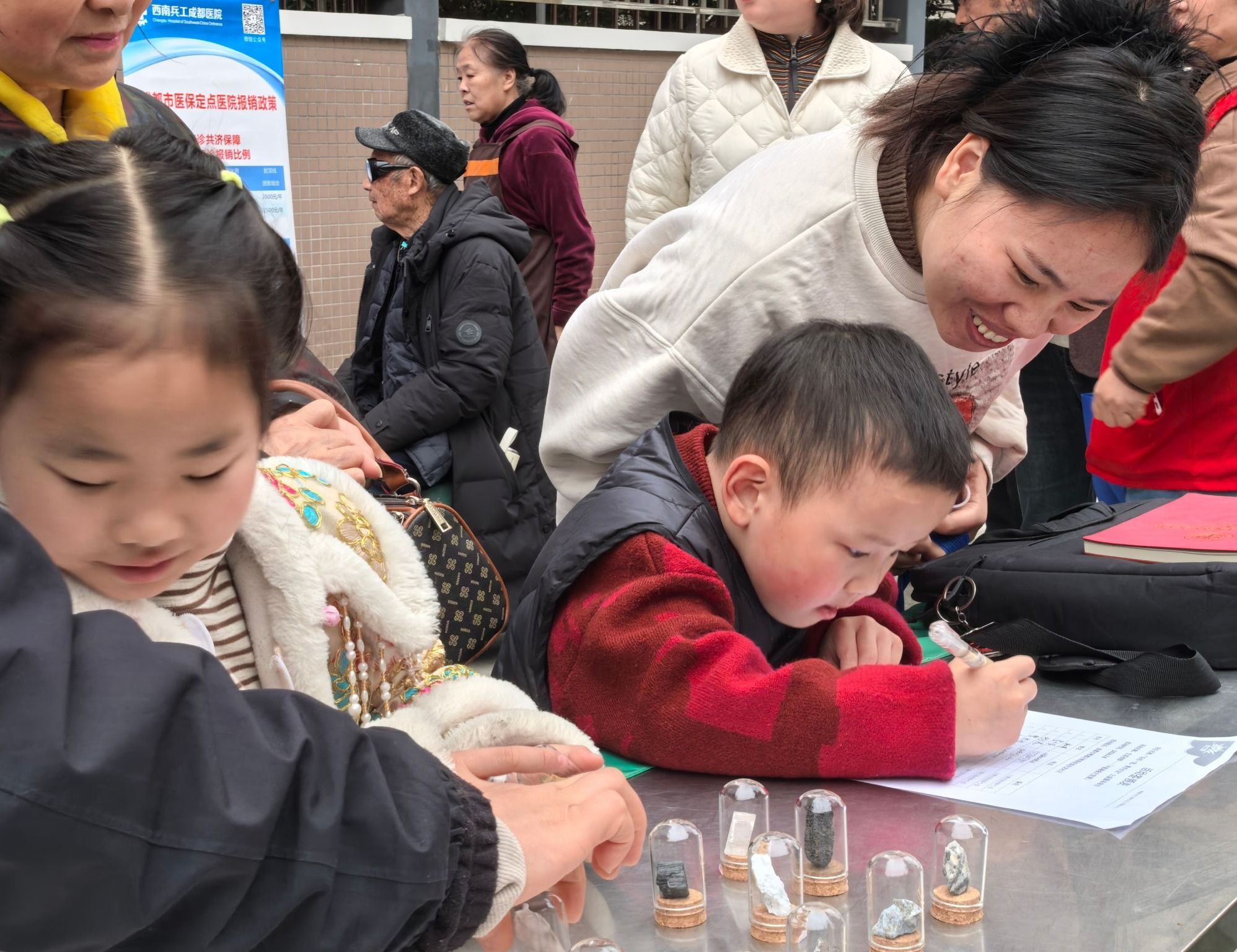 活动创新采用“室外互动+室内宣讲”的科普形式,兼顾趣味性与专业性。在室外展区,45种精美的岩石矿物标本成为连接科学与大众的纽带。面对从学龄前儿童到银发长者的多元受众群体,志愿者们耐心讲解岩矿成因,并通过趣味问答引导居民辨别标本。这种寓教于乐的方式,不仅让科学知识“活”了起来,更让居民在赢取心仪标本的喜悦中,切实感受到地质科学的魅力,现场气氛热烈,标本迅速分发完毕。
