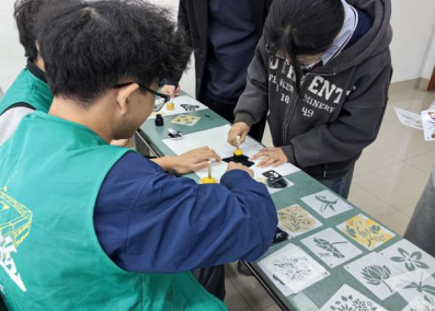 在拓印区,同学们选取春日草木、花鸟纹样的拓印模板,将其轻覆于宣纸之上,蘸取颜料,以海绵拓包均匀拍打、晕染。大家细心调整模板位置与颜料浓度,在反复拓印中让自然纹理跃然纸上,或勾勒出枝叶舒展的生机,或晕染出繁花盛放的暖意。在学生会志愿者的示范下,同学们逐步掌握拓印技巧,将春日草木的鲜活气息与自然意趣定格于纸面,留存下属于龙抬头时节的春日印记。
