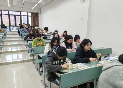 在竹编区,同学们手持纤细竹篾,对照图纸学习十字编、平纹编等基础竹编纹样,耐心穿梭、固定。大家从梳理竹篾、搭建基底开始,逐步掌握 “挑一压一” 的编织逻辑,指尖翻飞间将朴素竹材化作疏密有致、纹理清晰的竹编雏形。在学生会志愿者的指导下,大家不仅熟练运用胶带固定边缘、调整松紧,更在反复尝试中体会传统竹艺“刚柔并济、质朴雅致”的造物智慧,亲手将春日祈福的美好寓意编织进每一道纹路里。