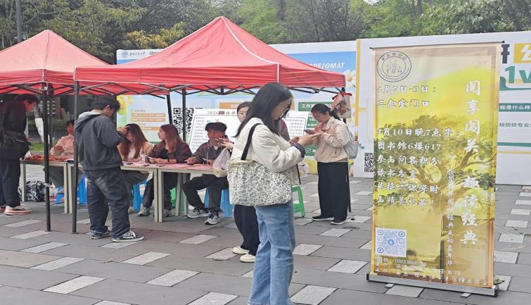 线上活动开启“读书金句分享”打卡通道,同学们踊跃分享经典著作中的暖心语句与阅读感悟,在文字的共鸣中传递阅读的力量。线下活动以摊位互动与深度分享为核心,分阶段有序开展活动。4月7日至9日,工作人员在三食堂门口设置特色活动摊位,将经典文学知识、阅读健心理念与趣味互动形式多元融合,开展知识问答、阅读便签书写、二手书籍捐赠等活动,使同学们在轻松的氛围中感受阅读乐趣。