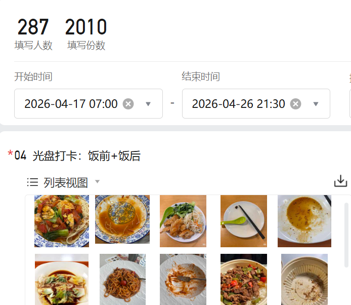 线上光盘打卡,厉行节约成风尚。4月17日—4月26日,为期十天的 “光盘行动” 线上打卡活动正式启动。参与者通过专属 QQ 群分享每日光盘照片,记录节约日常。活动累计收到打卡照片超2000张,越来越多同学主动加入光盘行列,用实际行动践行“拒绝舌尖上的浪费”,让绿色低碳、勤俭节约成为校园风尚。
