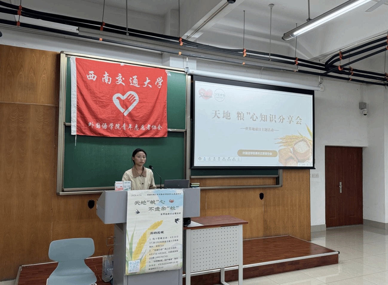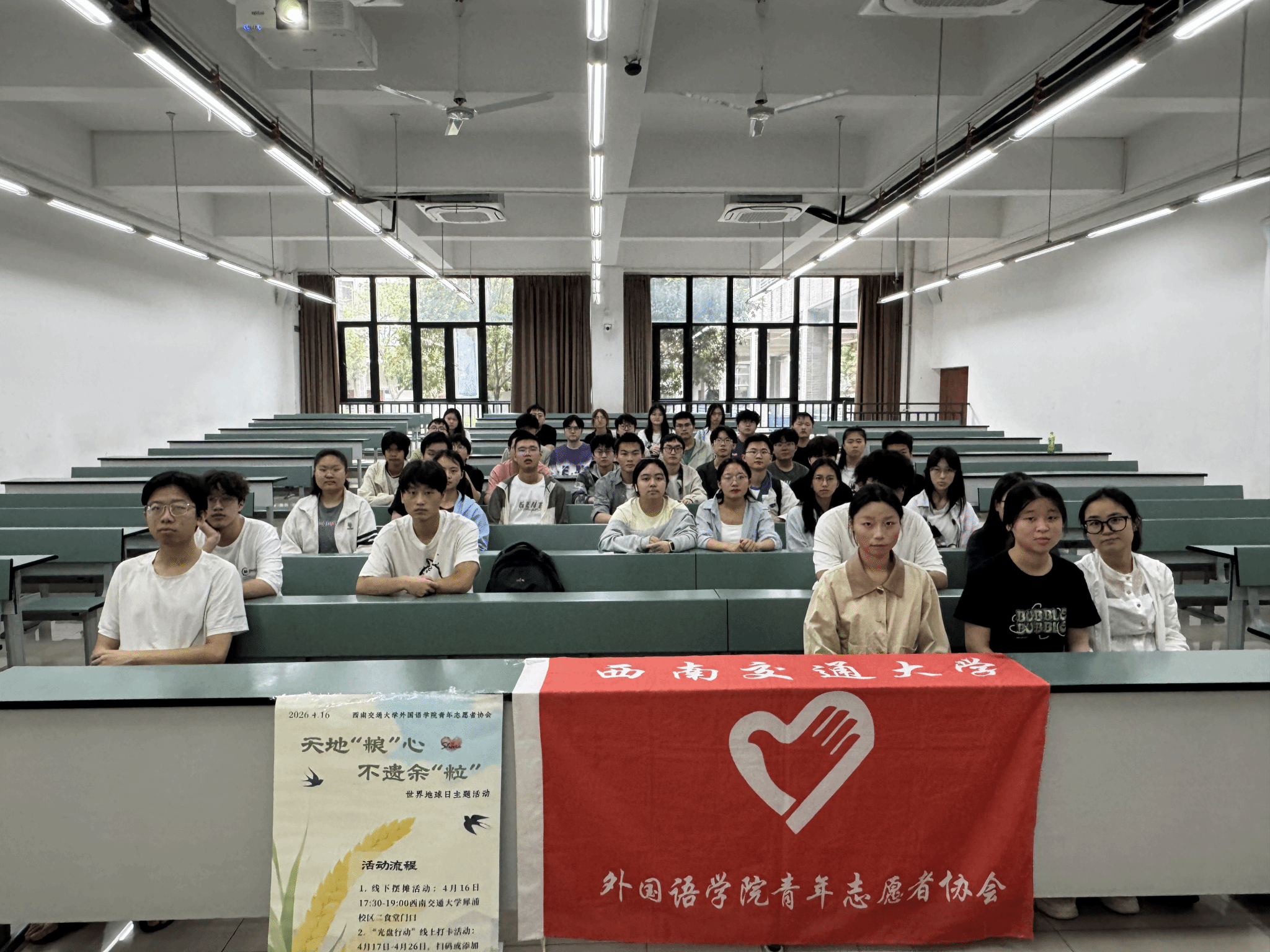 在第 57 个世界地球日来临之际,为深入践行绿色低碳发展理念,倡导爱粮节粮文明风尚,西南交通大学外国语学院青年志愿者协会(以下简称外语青协)于2026 年4月16日—4月26日,以“天地‘粮’心,不遗余‘粒’”为主题,面向全校开展世界地球日主题活动。活动采用线下摆摊宣传、线上光盘打卡、线下知识分享三种方式,覆盖全校400余名师生,以趣味互动、实践践行、深度宣讲相结合的形式,让绿色节约理念深入人心。