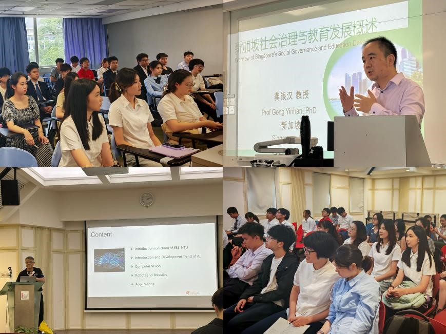 在实践环节,学员们进行校园参访活动,在南洋理工大学学生大使的带领下,切身感受这所世界顶尖学府的学术氛围和校园文化;交流活动中,学员们与当地学生就课程体系、科研项目及校园文化建设等议题进行了深入探讨,通过互动交流进一步加深了对国际顶尖高校教育模式的理解;而在新加坡设计与科技大学的专题讲座上,教授通过展示其研发的人工智能主题模型,引导各小组参与研讨实践,同学们近距离了解了机器人技术的最新进展及其实际应用,拓宽了视野,提升了实践能力。