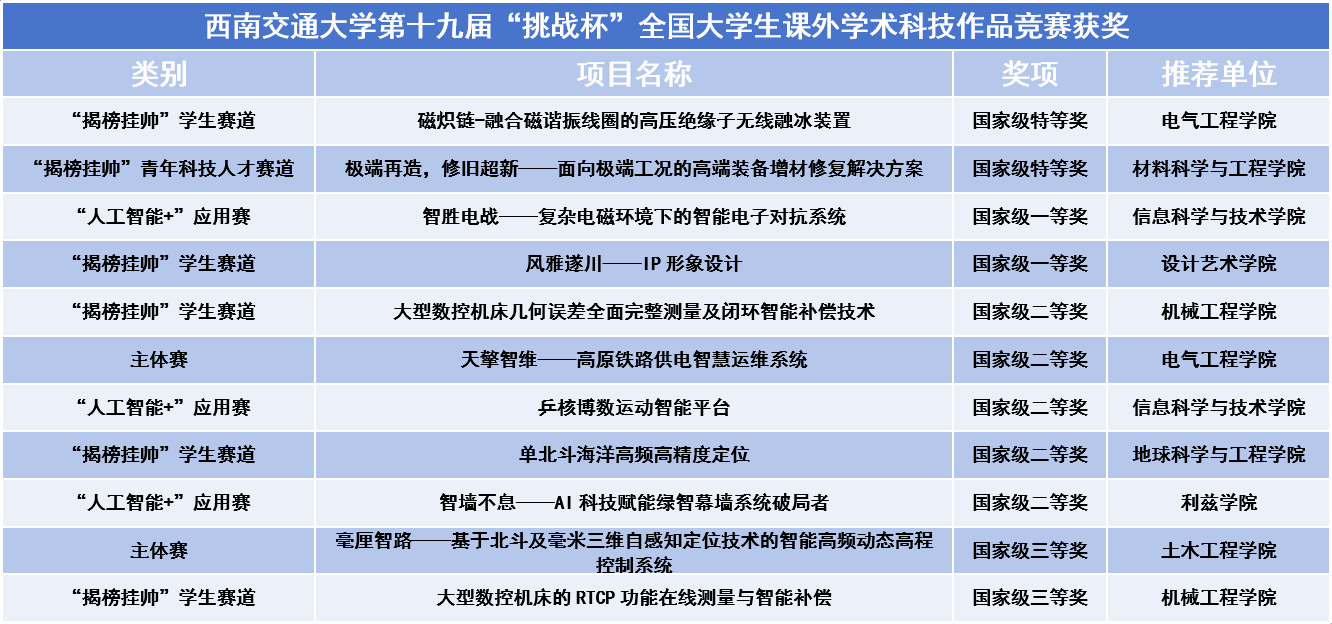 西南交通大学在第十九届“挑战杯”全国大学生课外学术科技作品竞赛中喜获佳绩!