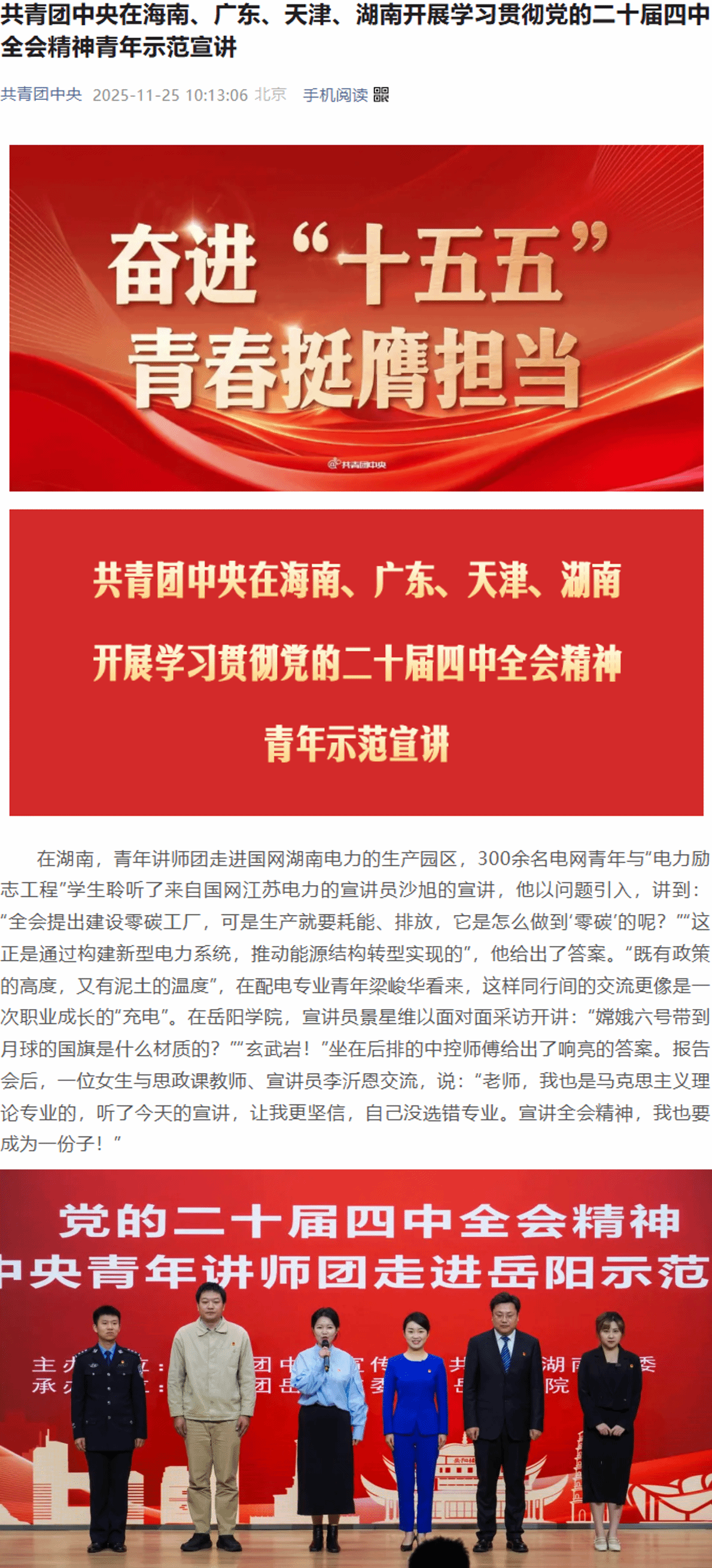 近日,共青团中央组织开展党的二十届四中全会精神青年讲师团示范宣讲活动。我校马克思主义学院副教授、校团委兼职副书记景星维作为团中央青年讲师团成员,赴湖南、湖北多地面向青年开展宣讲。